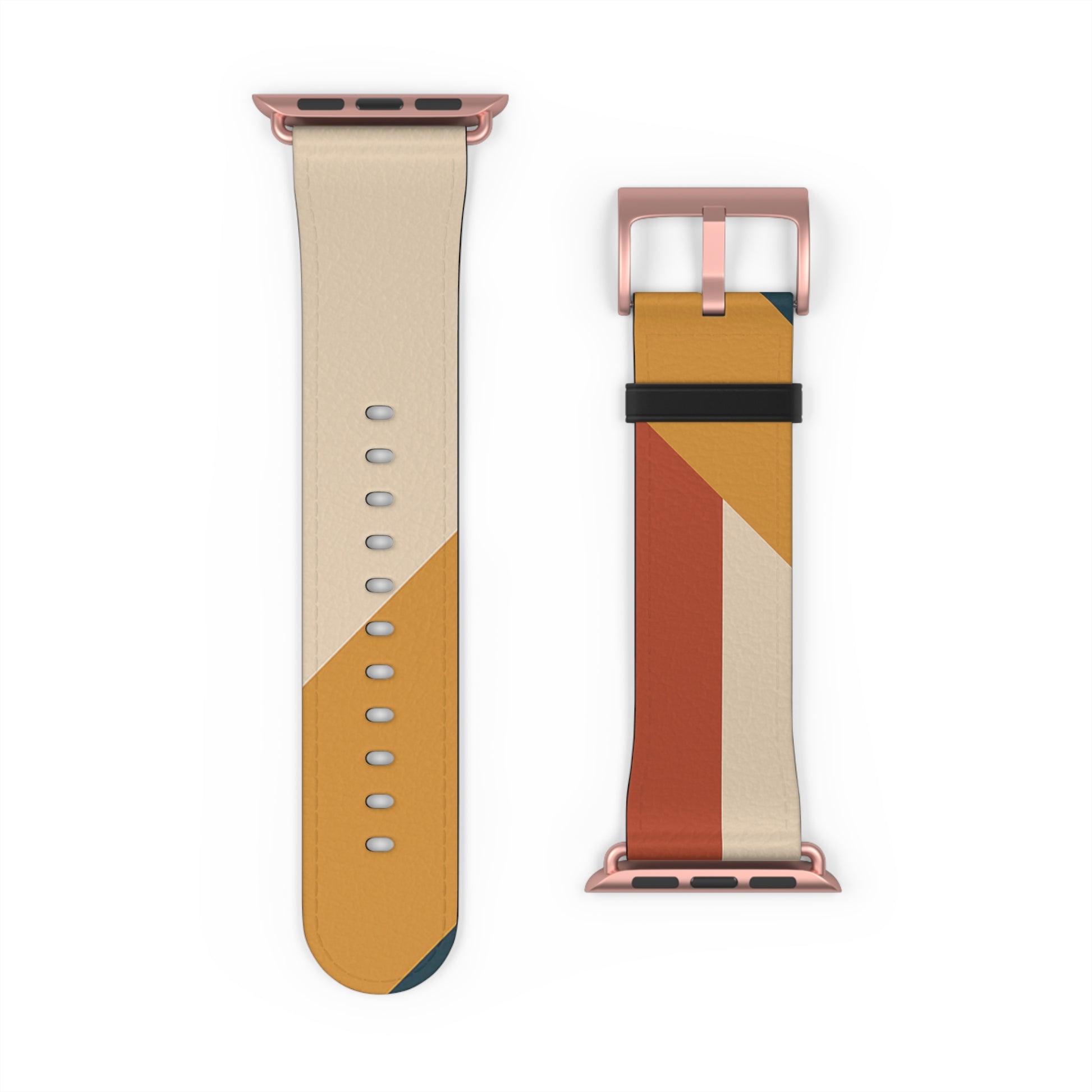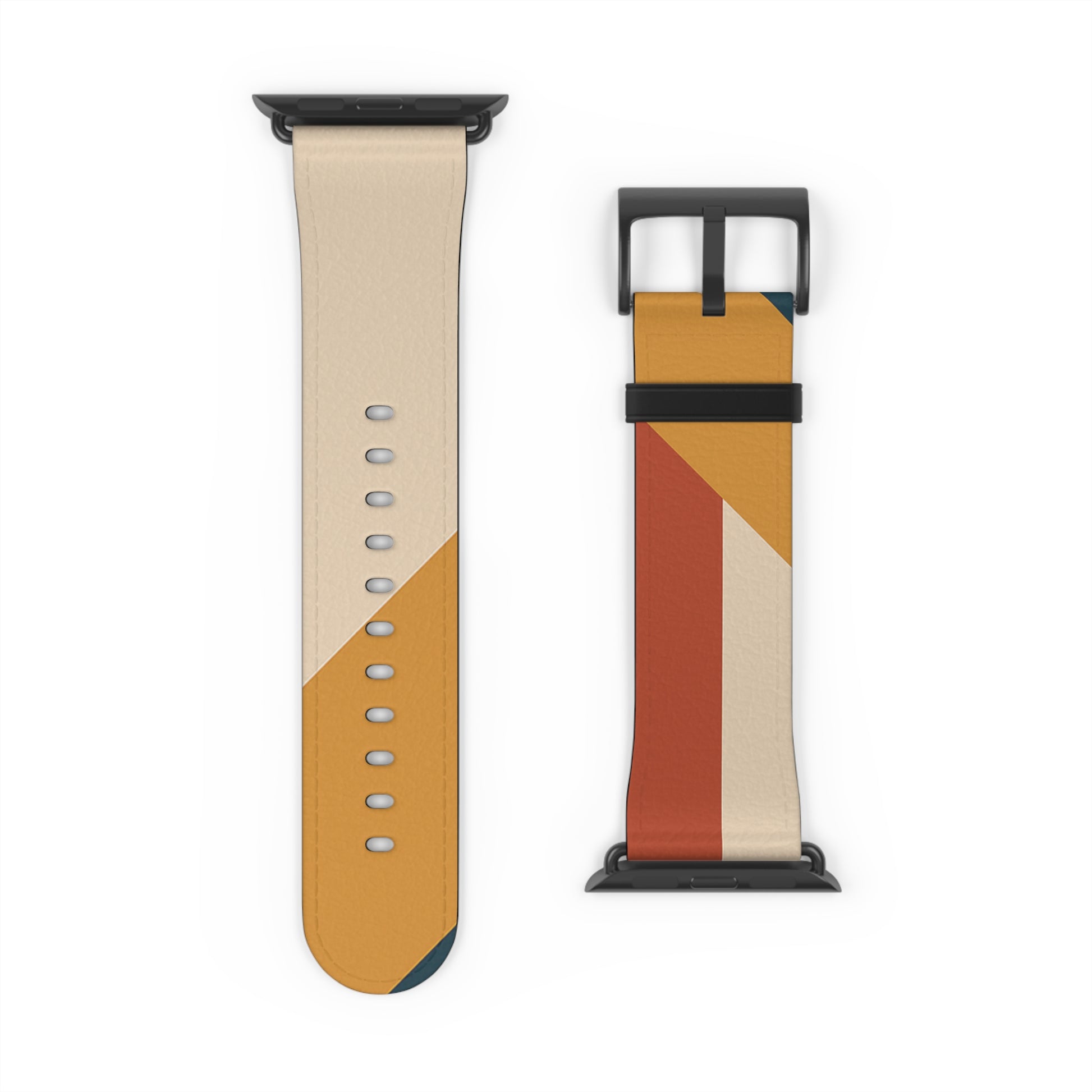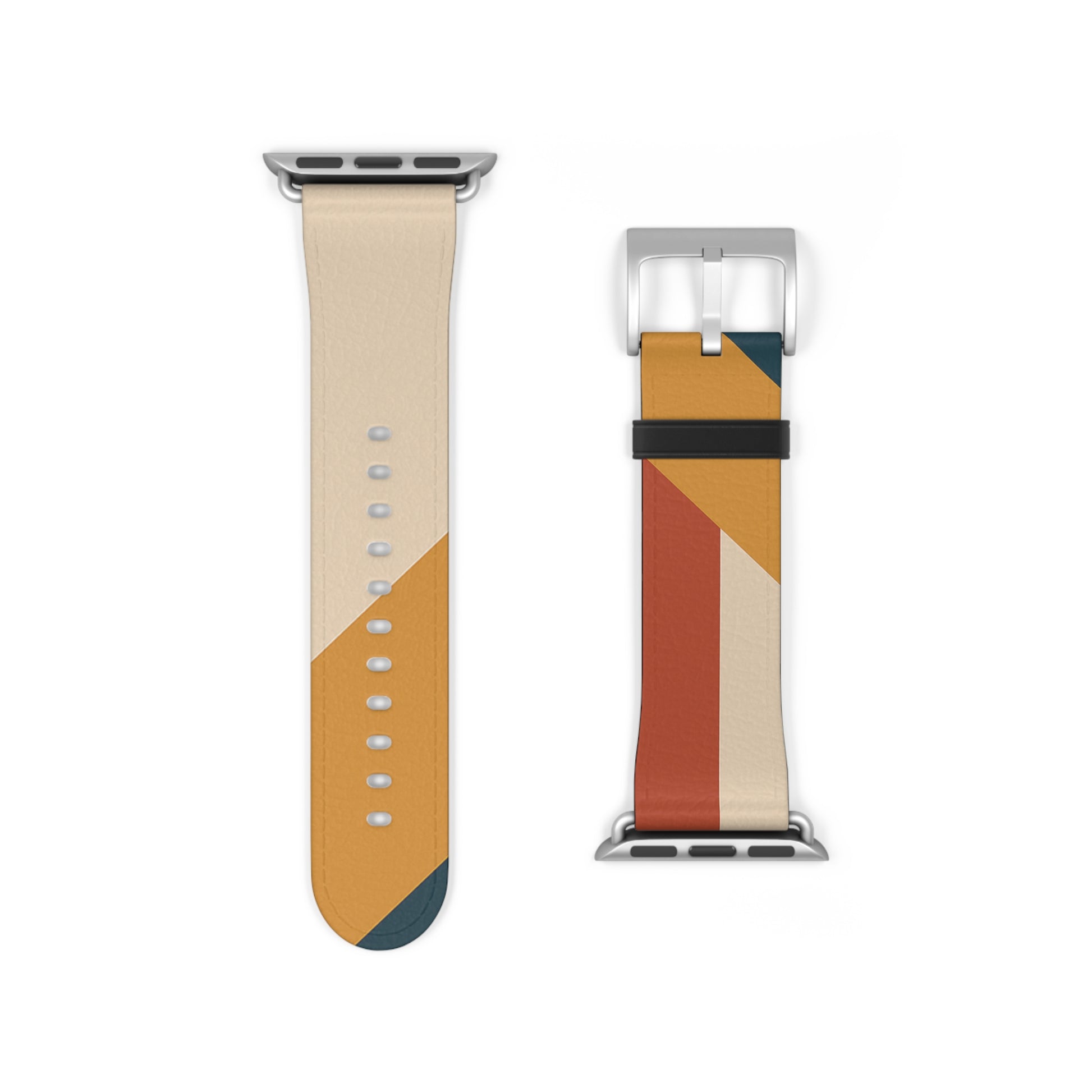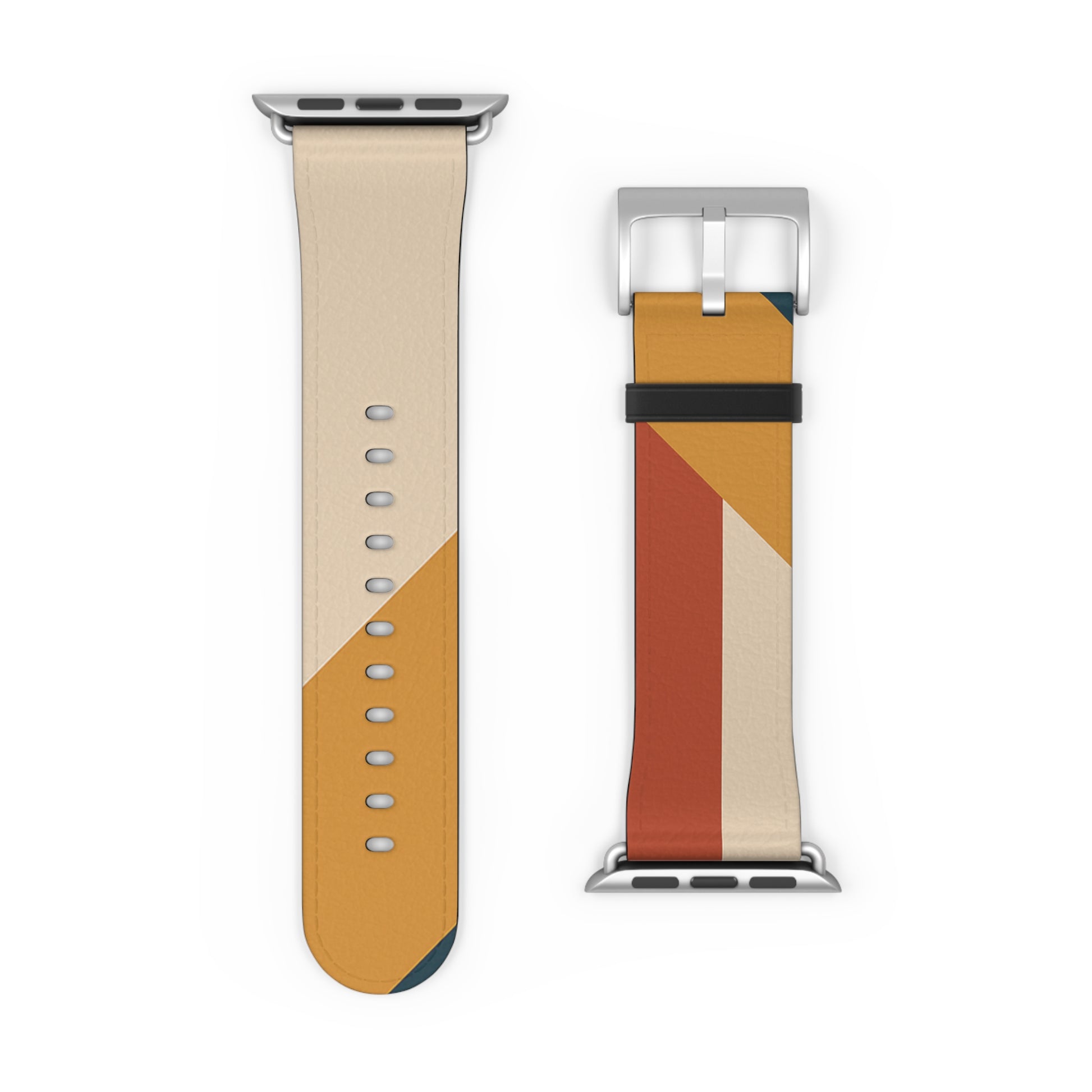 Angles meet attitude. The “Diagonal Drift” strap slices through convention with bold diagonal sections in burnt orange, mustard gold, deep navy, and Rice Paper cream. Clean lines and sharp intersections create a dynamic sense of movement—this is geometry with momentum.