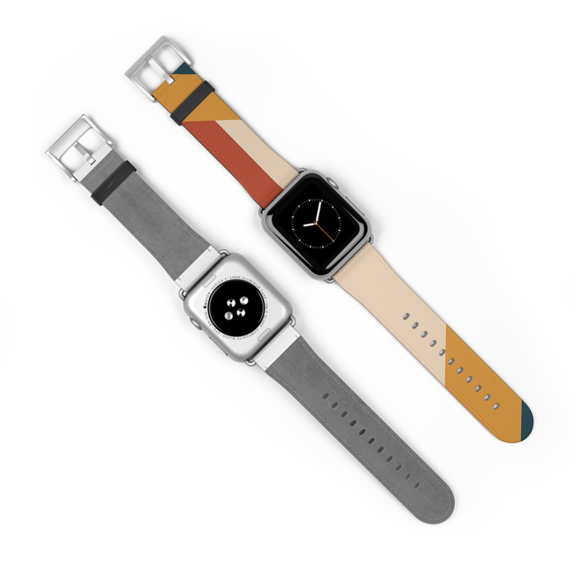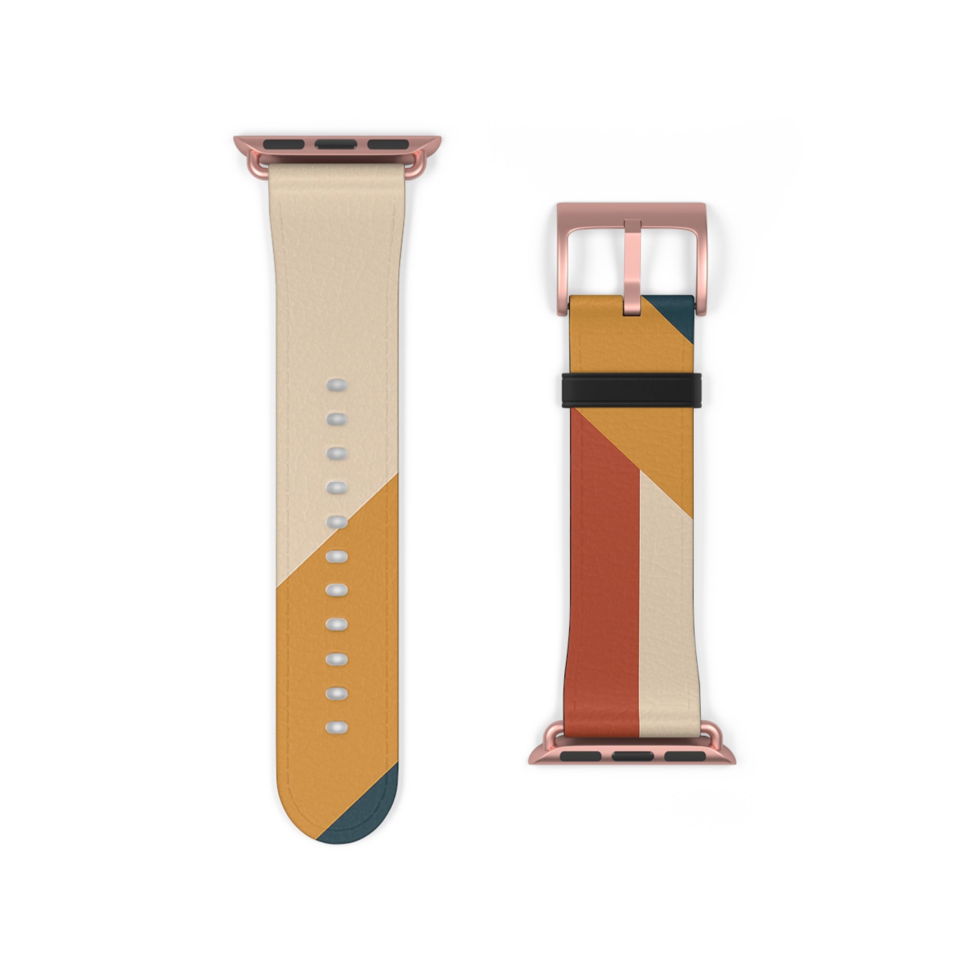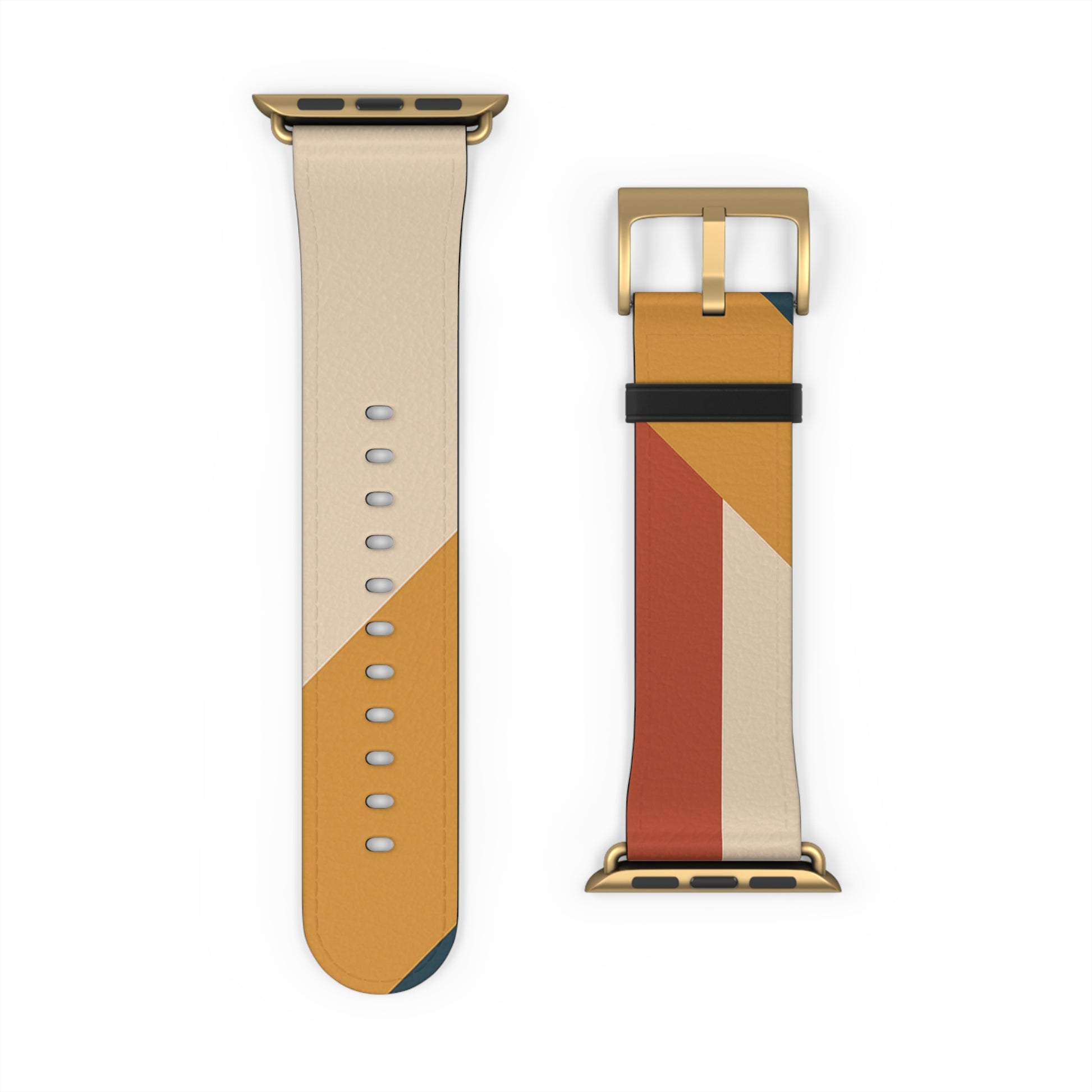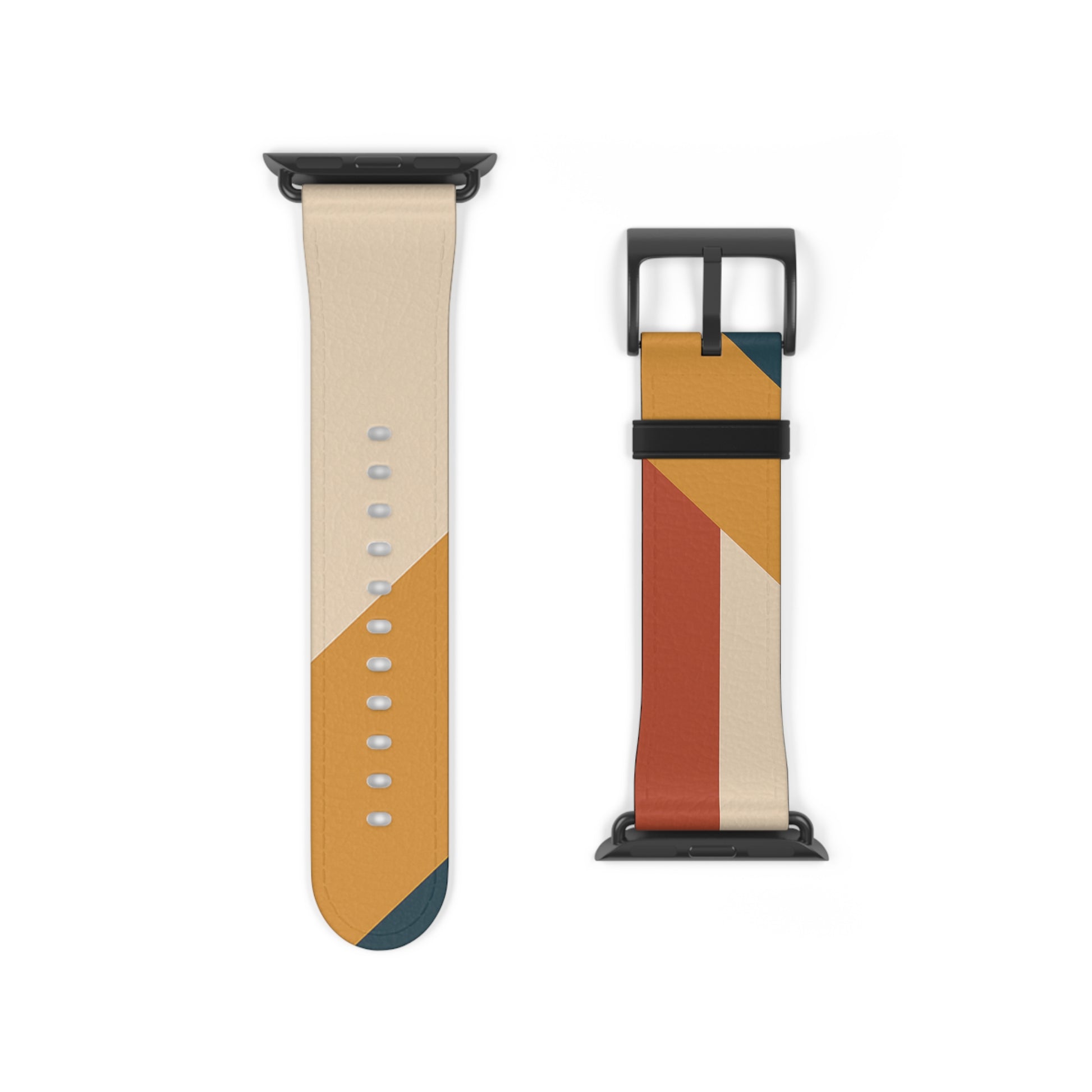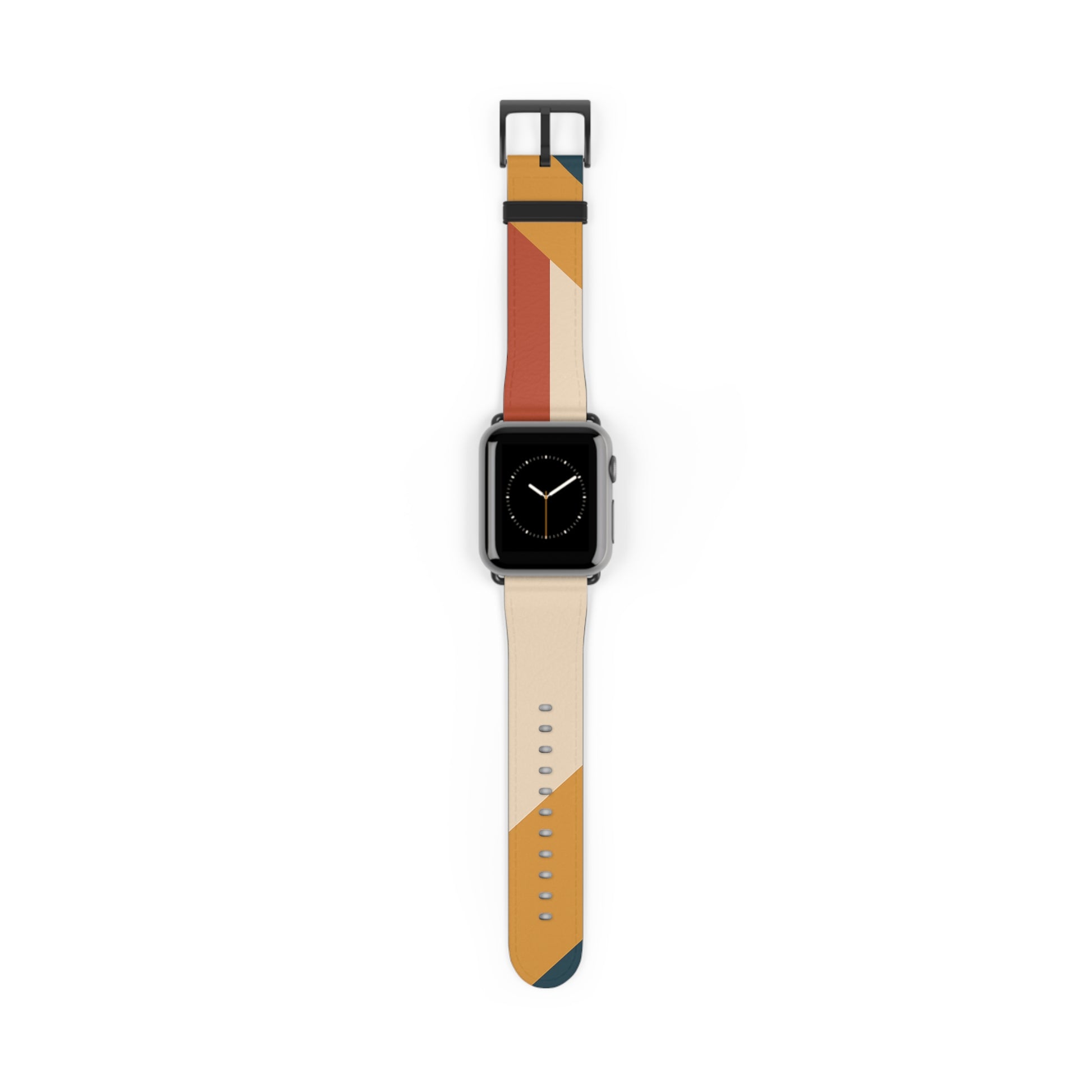 Angles meet attitude. The “Diagonal Drift” strap slices through convention with bold diagonal sections in burnt orange, mustard gold, deep navy, and Rice Paper cream. Clean lines and sharp intersections create a dynamic sense of movement—this is geometry with momentum.