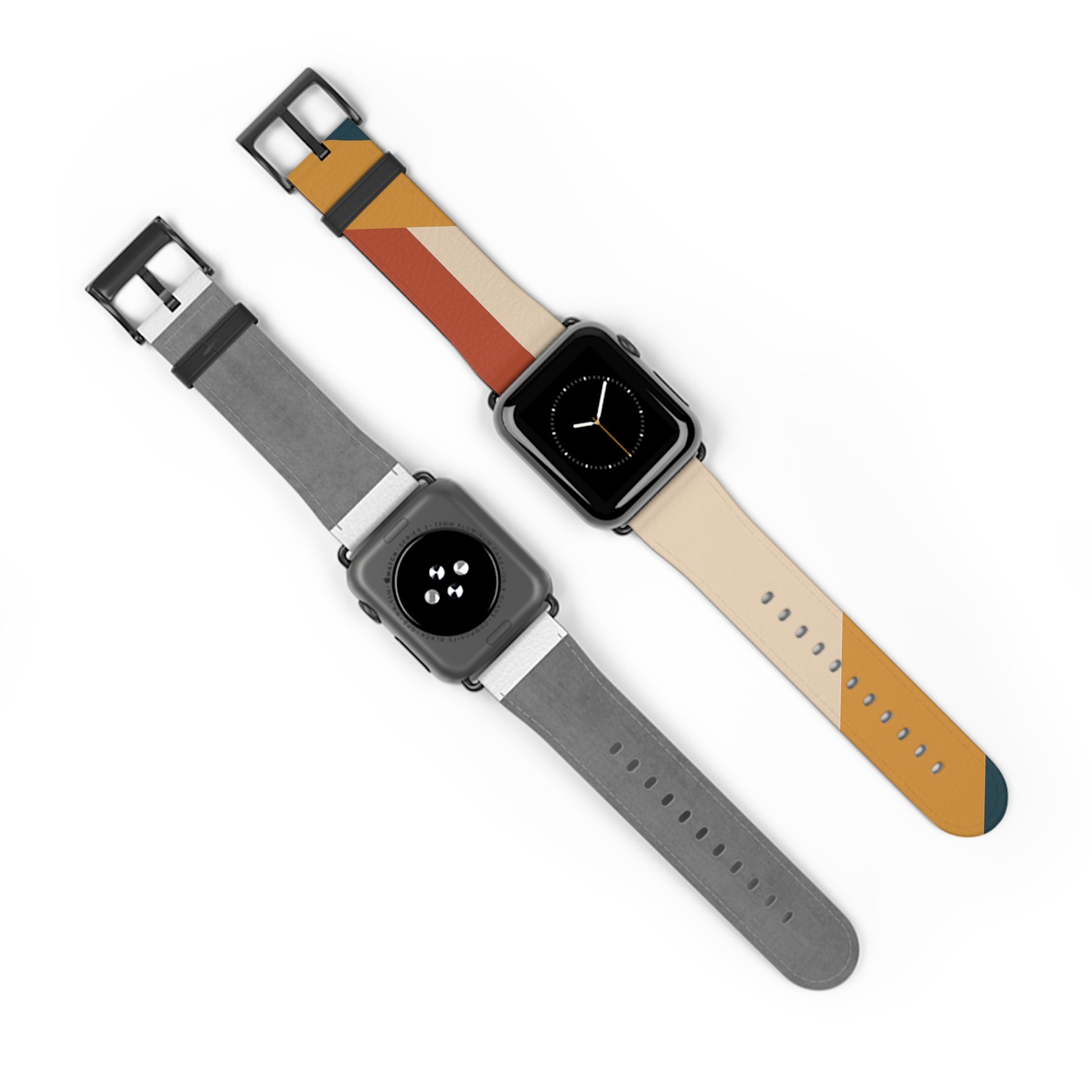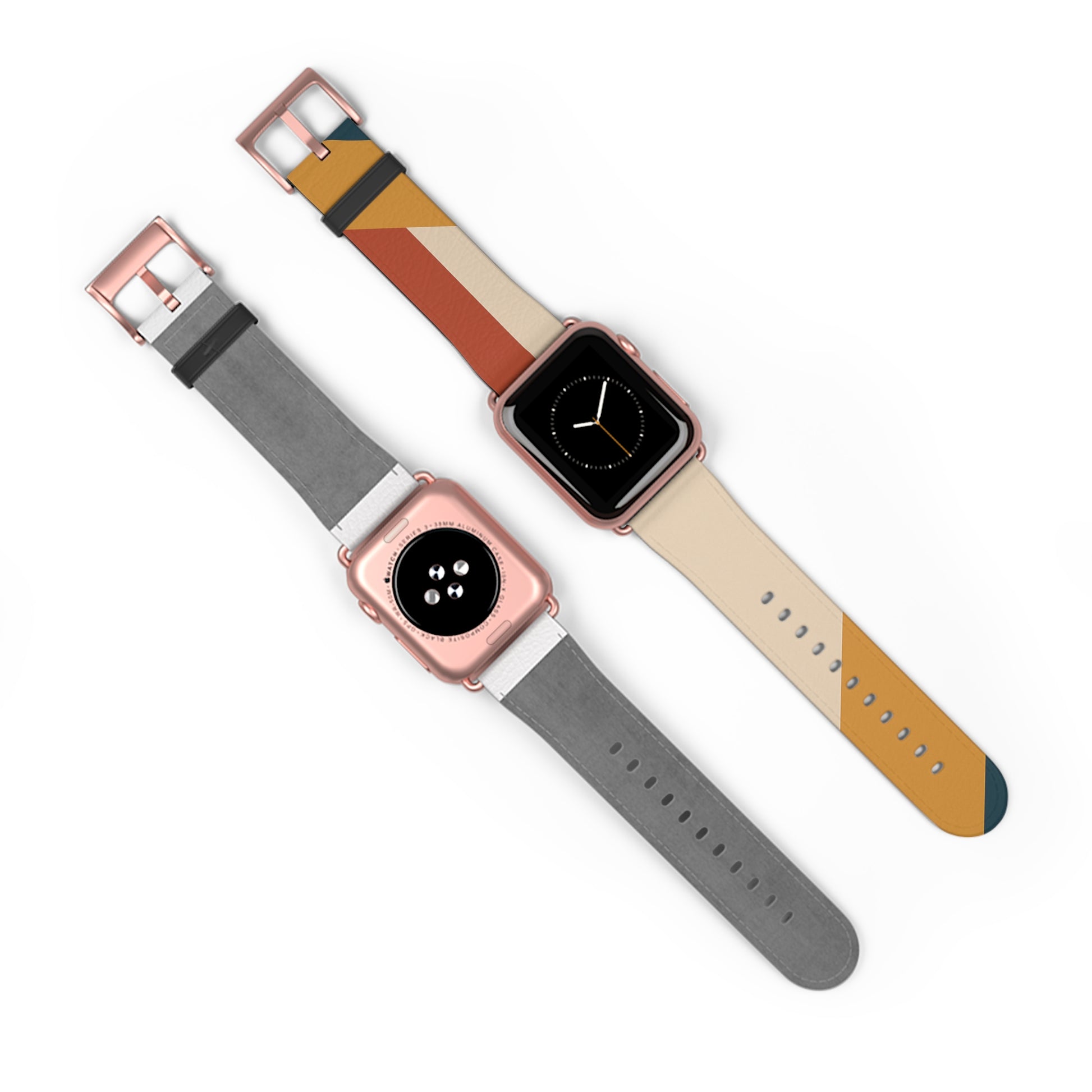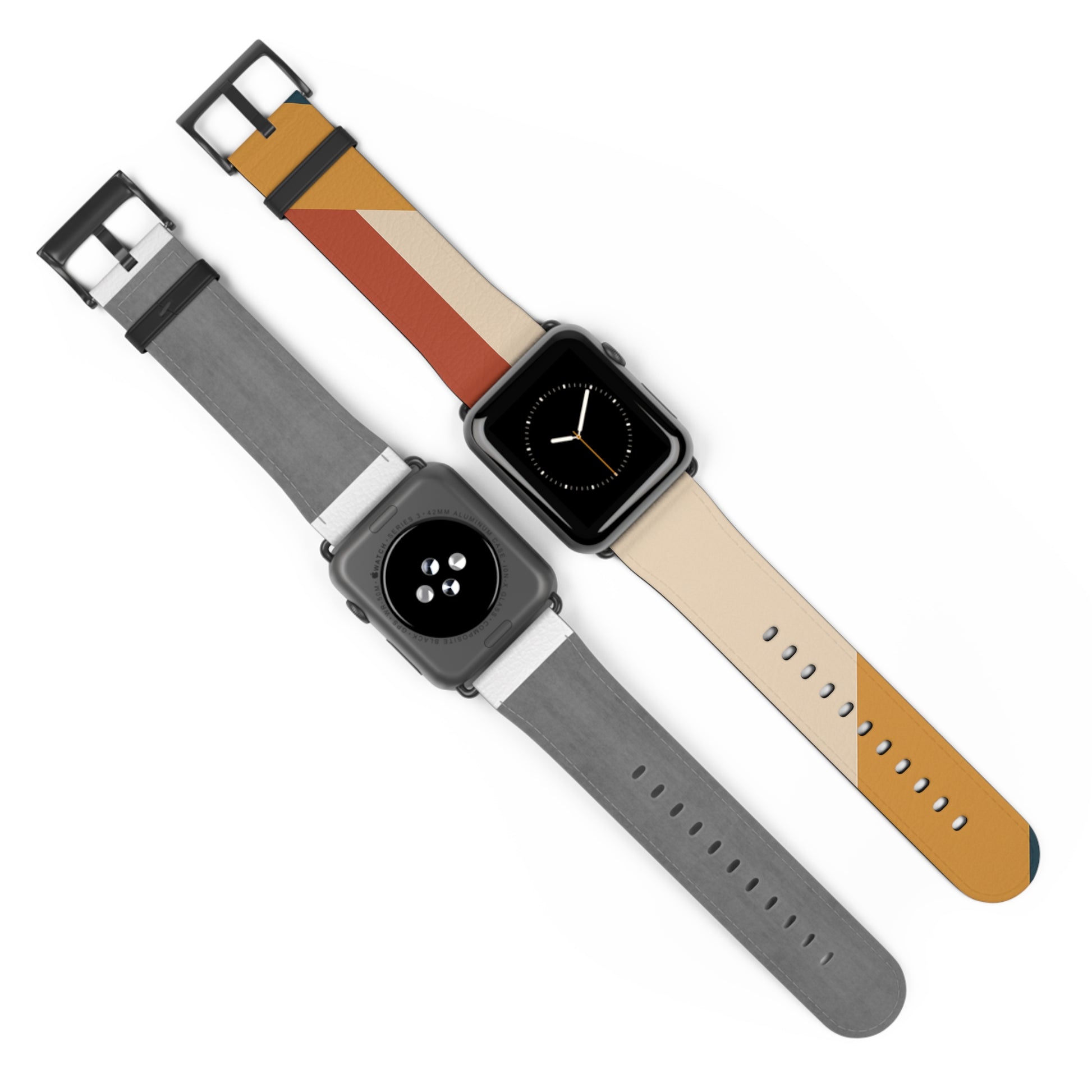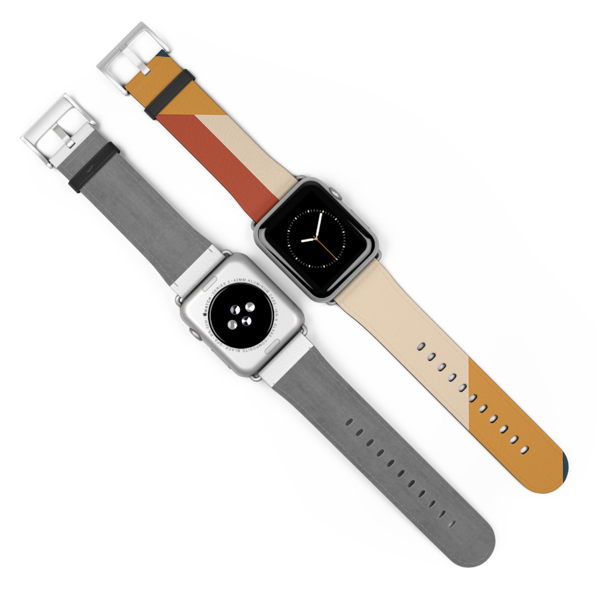 Angles meet attitude. The “Diagonal Drift” strap slices through convention with bold diagonal sections in burnt orange, mustard gold, deep navy, and Rice Paper cream. Clean lines and sharp intersections create a dynamic sense of movement—this is geometry with momentum.