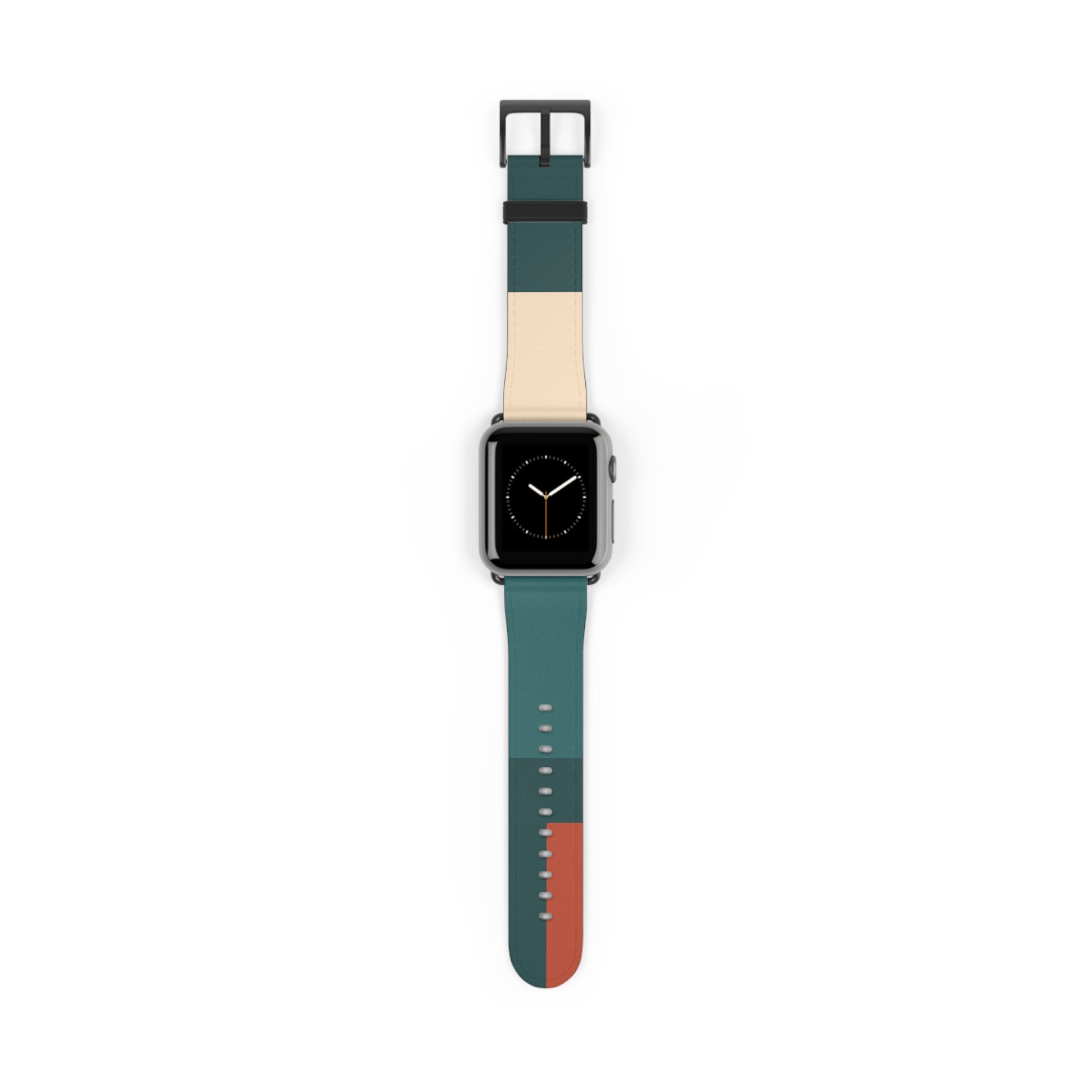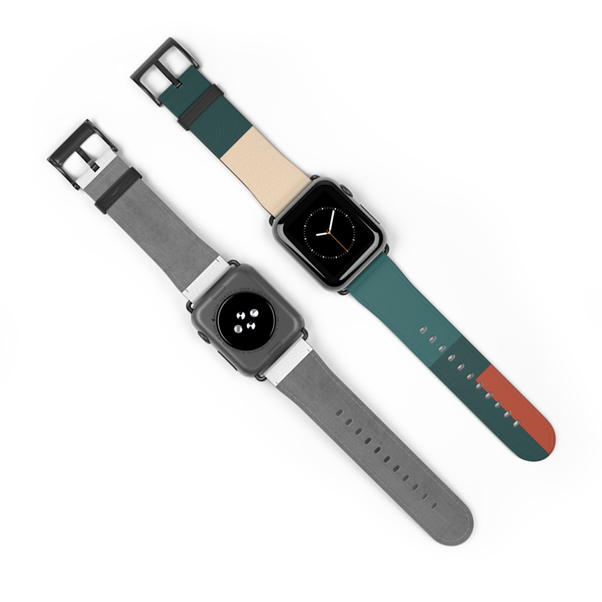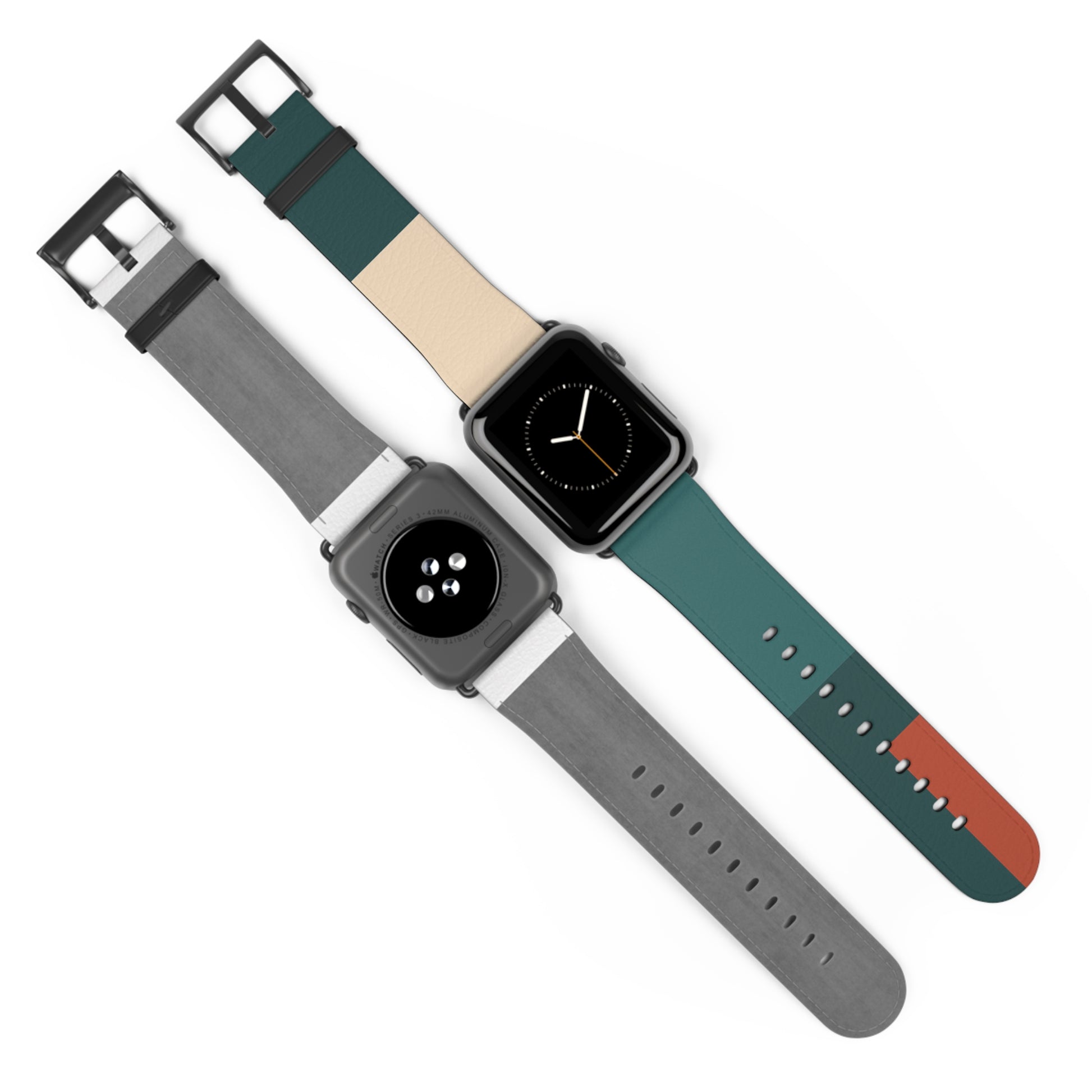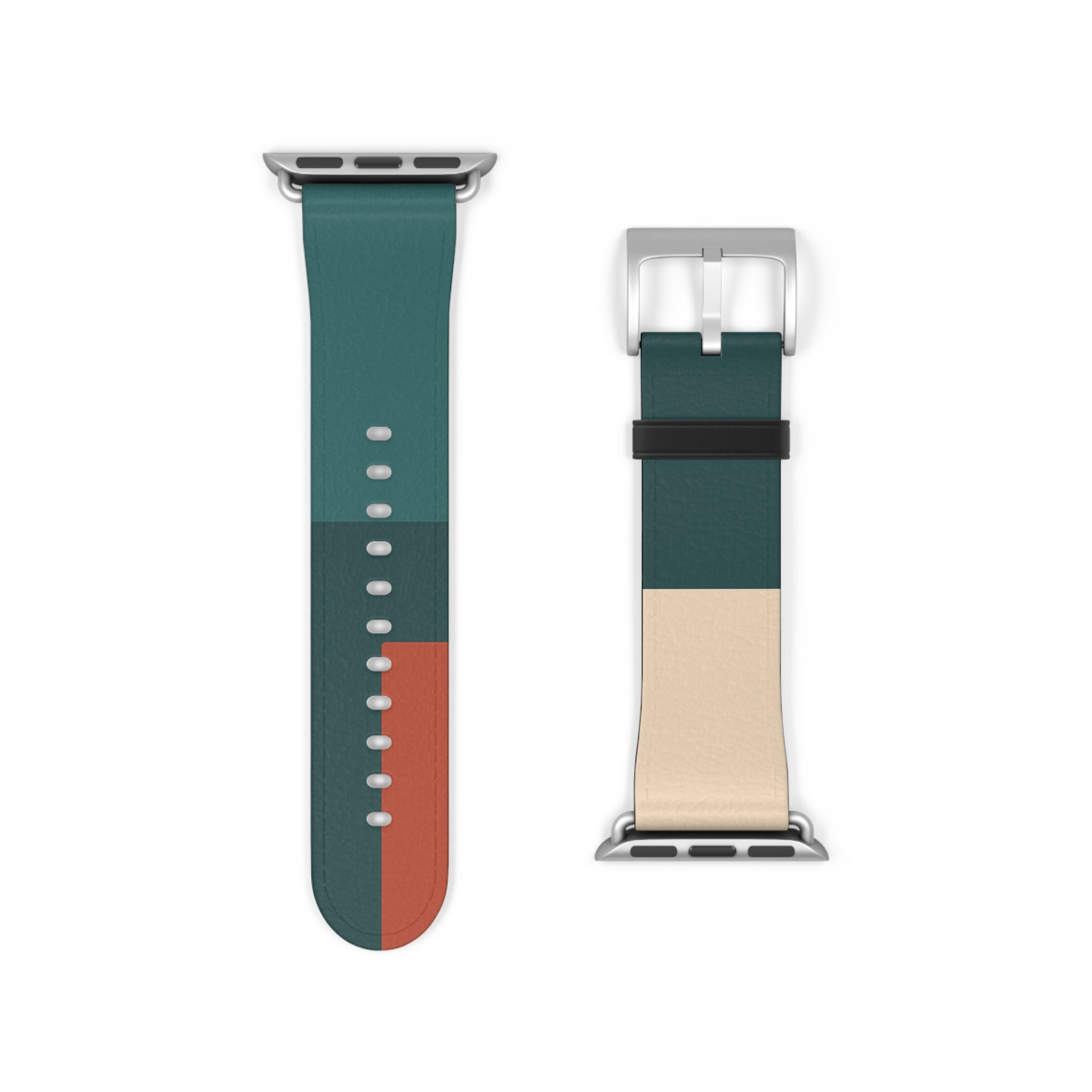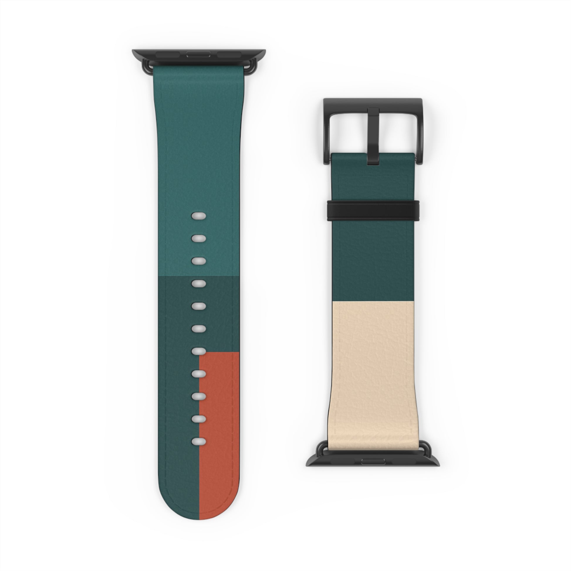 A refined take on color theory and composition, the “Shifting Fields” strap features bold, clean color blocks in muted teal, ochre, ivory, and terracotta. Each section is placed with intention—inviting the eye to travel across the strap like a modernist canvas.
