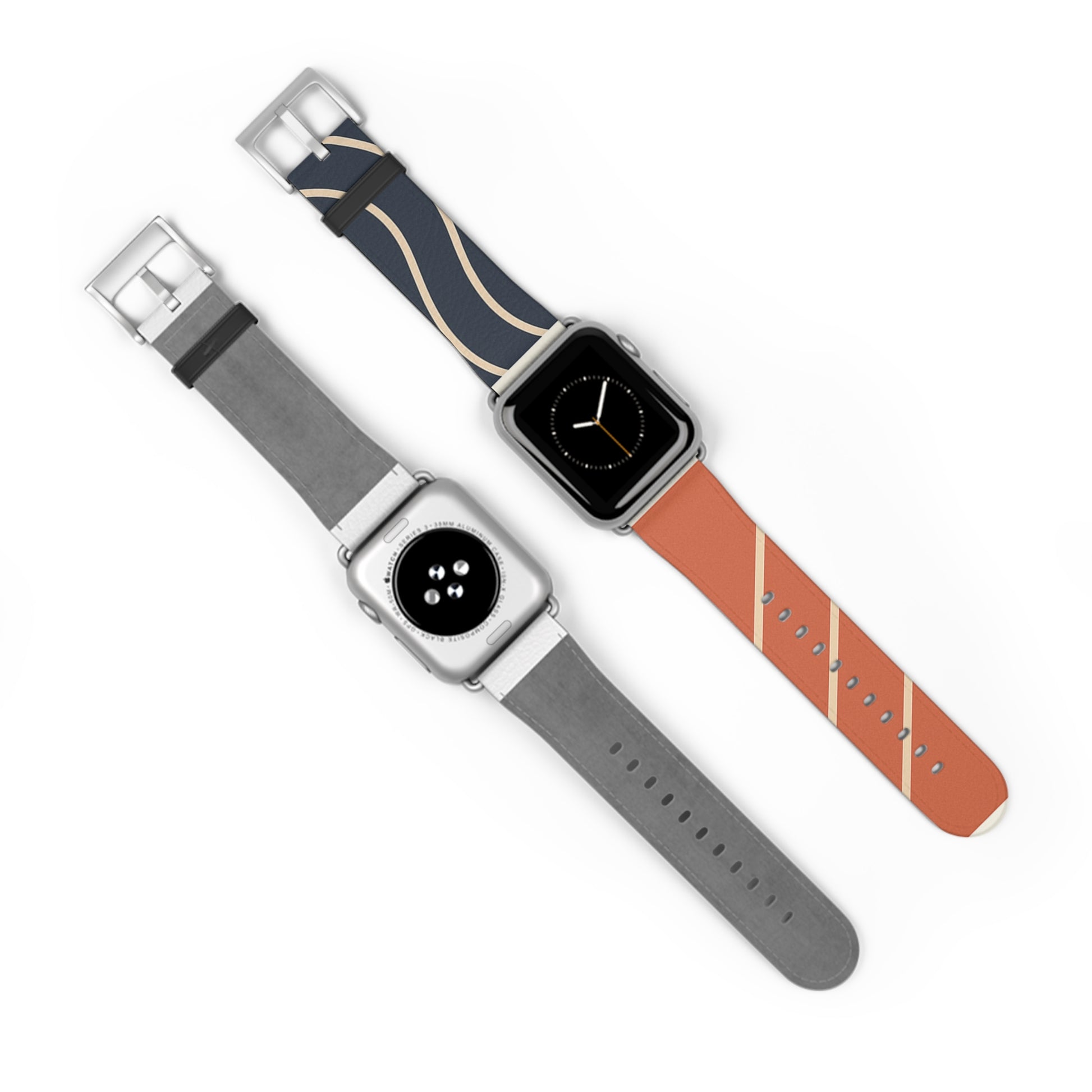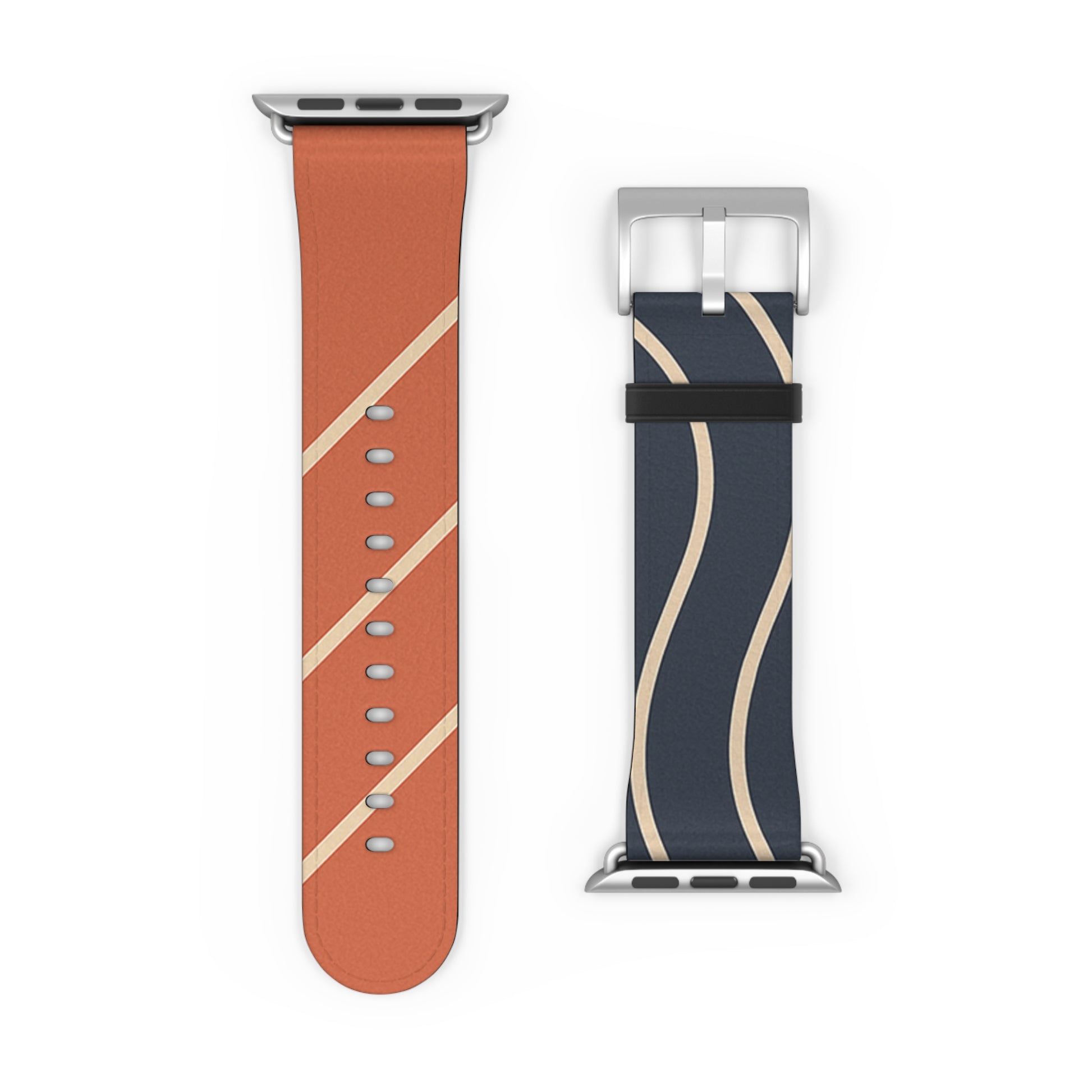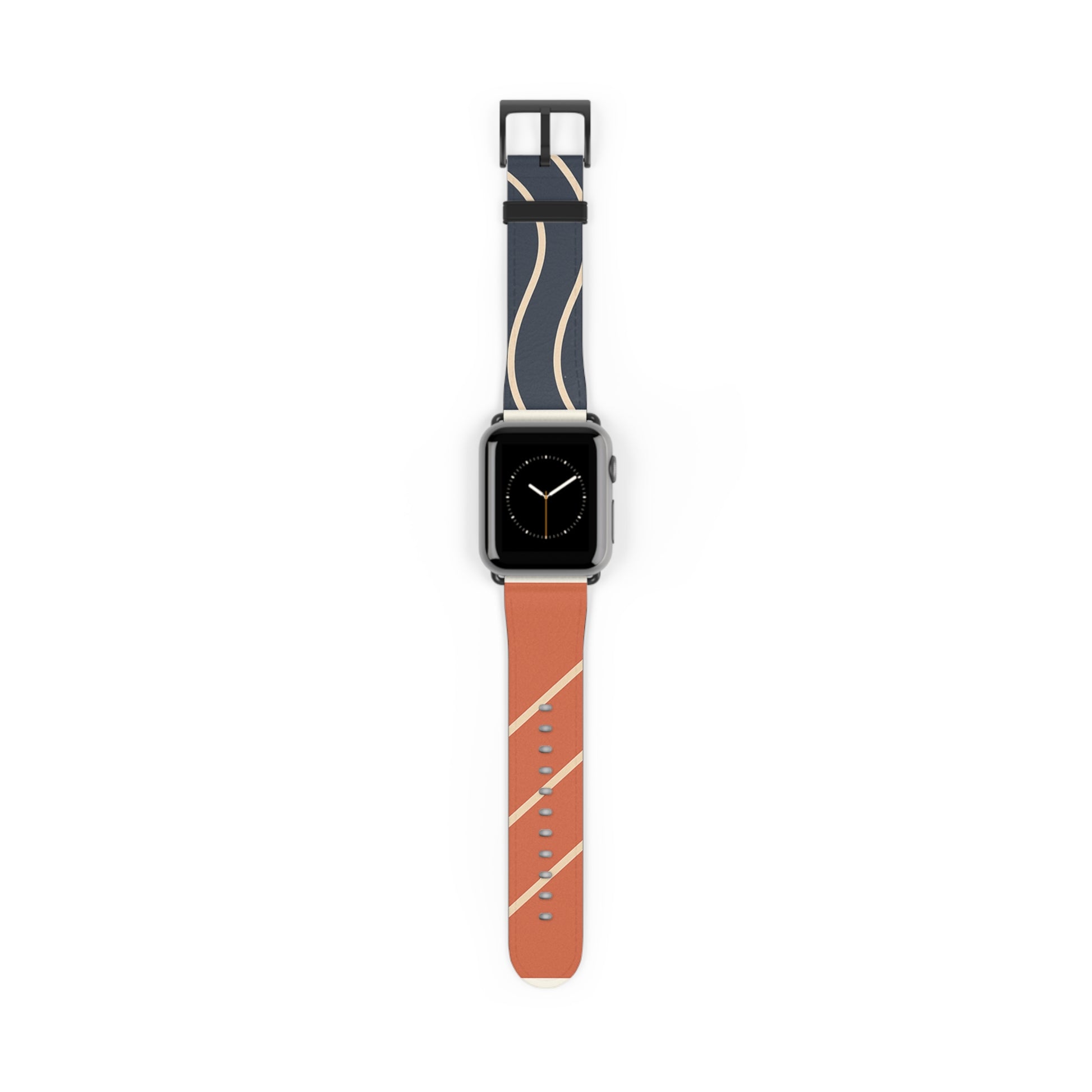 The “Waves & Angles” strap pairs bold navy with warm terracotta, accented by clean ivory lines that curve and cut across each panel with intention. One half evokes motion through fluid arcs, the other brings structure through diagonals—together, a minimal yet expressive balance of movement and form.