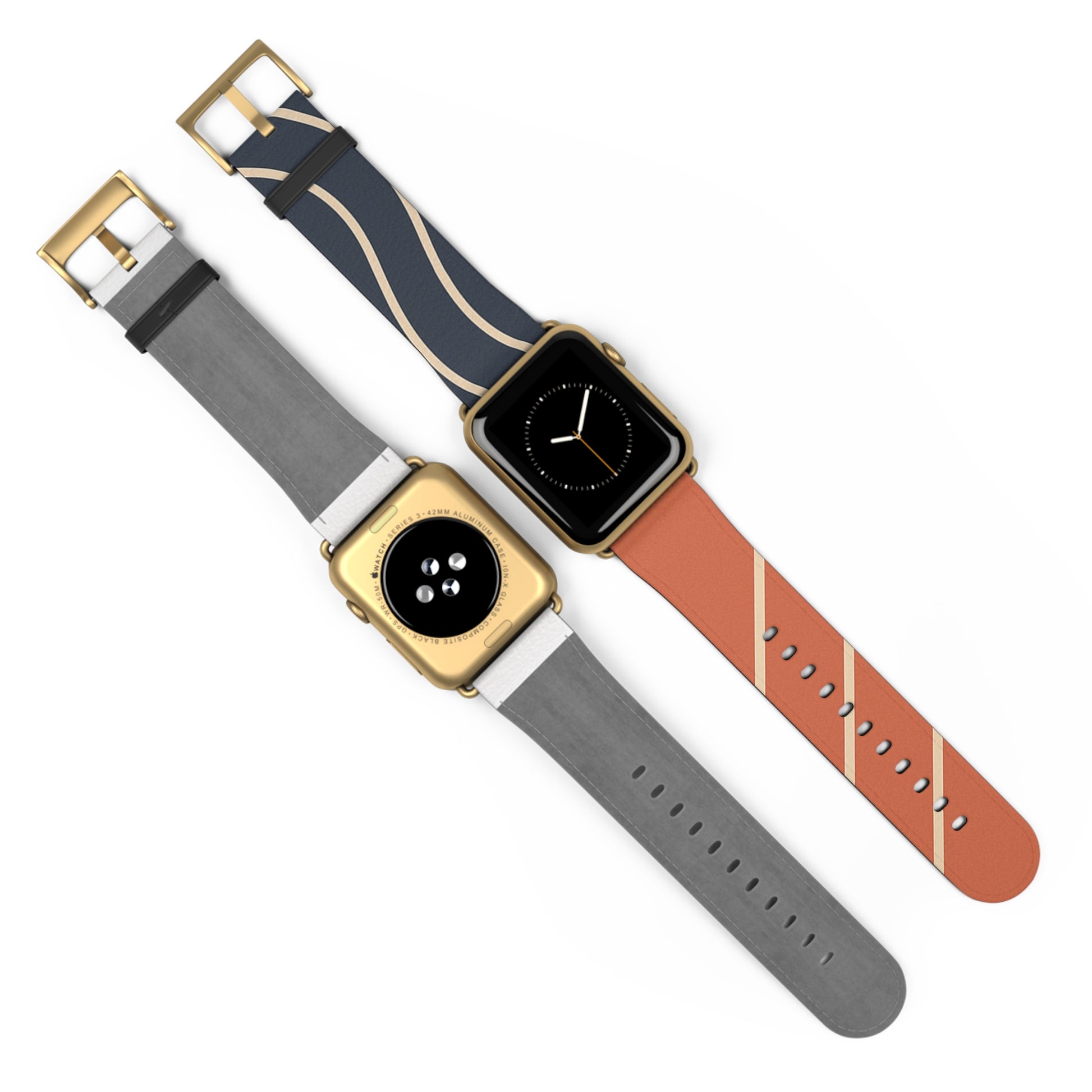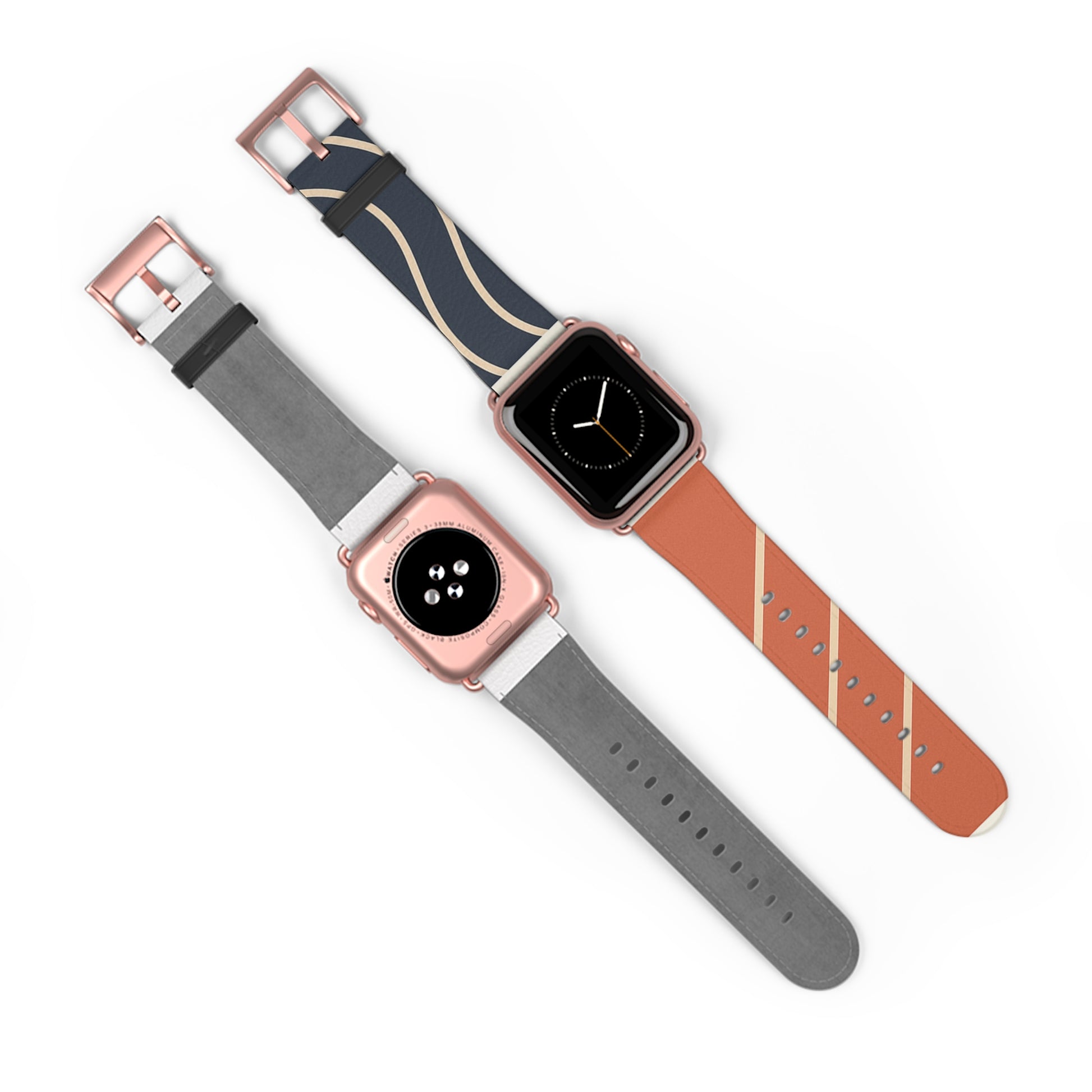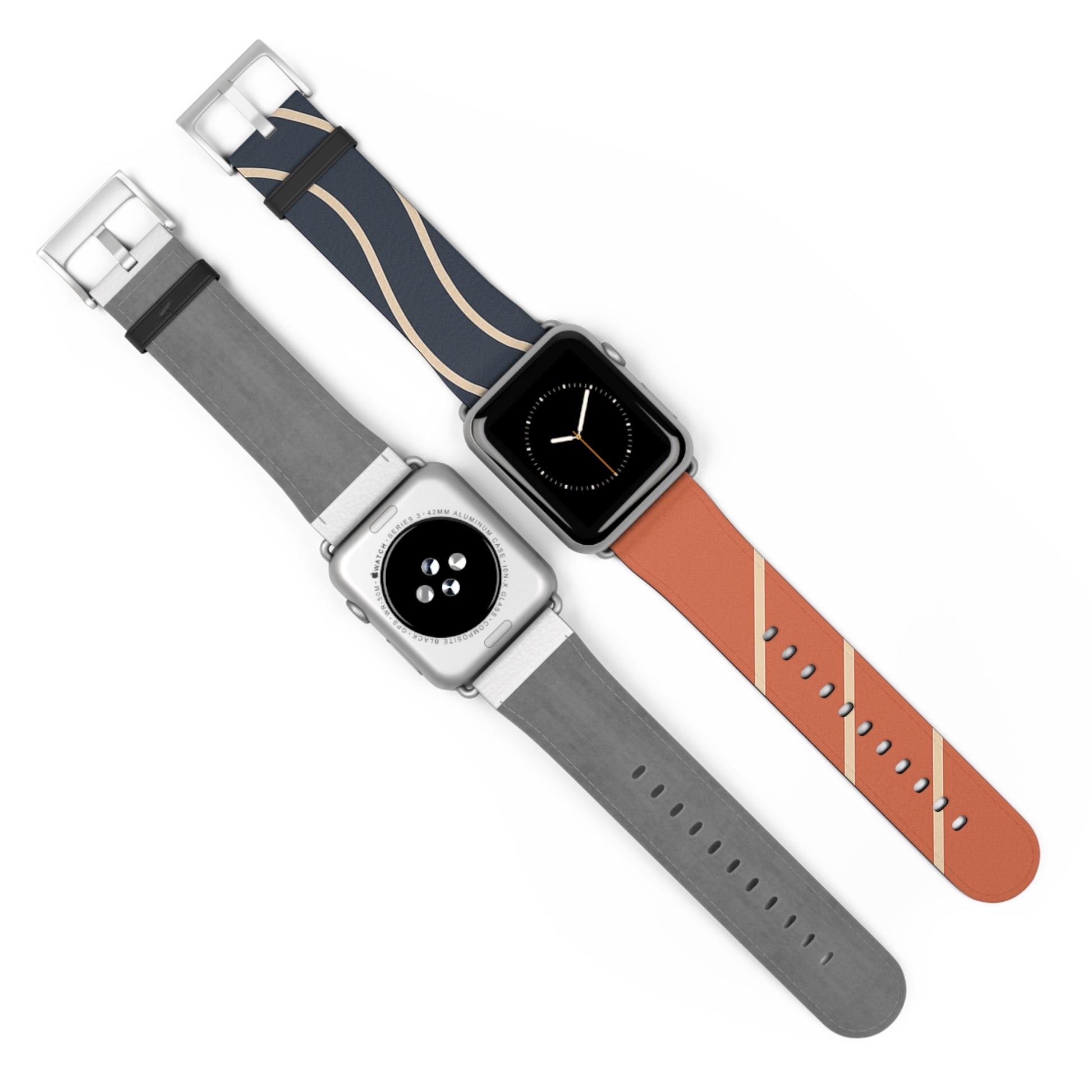 The “Waves & Angles” strap pairs bold navy with warm terracotta, accented by clean ivory lines that curve and cut across each panel with intention. One half evokes motion through fluid arcs, the other brings structure through diagonals—together, a minimal yet expressive balance of movement and form.